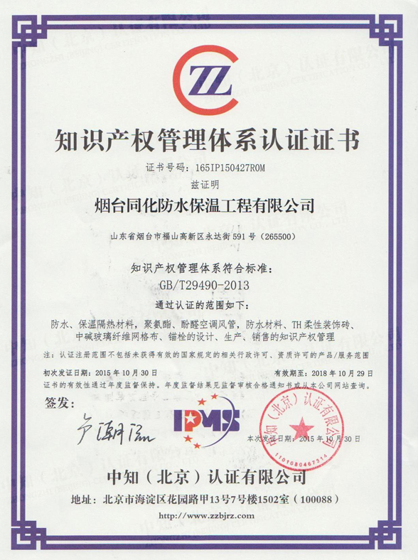 煙臺(tái)同化防水保溫工程有限公司,以其完整規(guī)范的知識(shí)產(chǎn)權(quán)管理流程及卓有成效的知識(shí)產(chǎn)權(quán)實(shí)施效益,通過《企業(yè)知識(shí)產(chǎn)權(quán)管理規(guī)范》(GB/T-29490)的國(guó)家標(biāo)準(zhǔn)認(rèn)證審核,成為煙臺(tái)福山區(qū)首家通過《企業(yè)知識(shí)產(chǎn)權(quán)管理規(guī)范》認(rèn)證的企業(yè)。